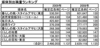 主要八誌では、産経新聞の「くらしの百科・大阪」を除く媒体で広告料が減少した。朝日新聞では「暮らしの風」を昨年10月に刷新し、「スタイルアサヒ」を創刊。発行部数がほぼ半分になったことで、広告料も値下げとなっている。一方、読売新聞でも昨年6月に「読売家庭版」を刷新し、生活情報誌として「リエール」を創刊したが、広告料は据え置いている。