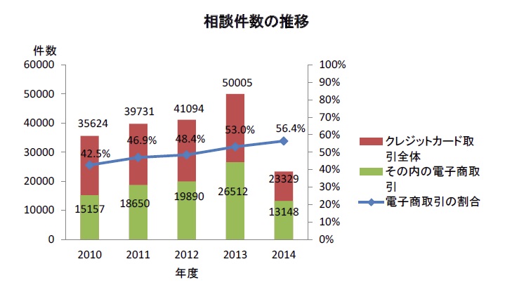 2014年度にPIO―NETに寄せられたクレジットカードのトラブルに関する相談件数は2万3329件(9月30日までの集計)で、鈴木委員はクレジットカードの取引に関するトラブル相談件数が年々増加傾向にあるとし、そのうち電子商取引に関するものが6割程度にまで増えているとした。