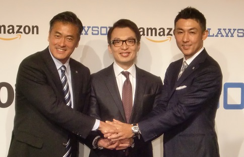 ローソンは11月5日から、コンビニ店頭でアマゾン商品を注文できるサービスを開始した。利用者は店内の端末でアマゾンの通販サイトの商品を選んでレジで決済後、最短2日で商品を店頭で受け取れる。注文時にオペレーターと話ながら購入サポートを受けたり、商品選びができる。高齢者などネット販売利用に不慣れな層の利用を見込む。一部地域で開始後、来春から全国で本格展開する。来店促進策や手数料収入確保のほか、来年から本格化させる「御用聞き」のための品ぞろえ充実を狙う。(写真は記者発表会の様子。ローソンの玉塚社長㊧とアマゾンジャパンのチャン社長㊥、ローソンの野辺執行役員ホームコンビニエンス事業本部長)