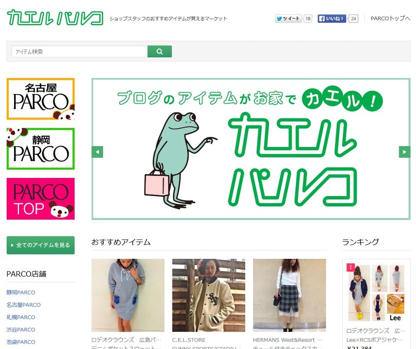 「カエルパルコ」(画像)はスタートトゥデイ子会社が提供する簡単通販サイト開設サービス「ストアーズ・ドット・ジェーピー」と連携し今年5月にスタート。静岡パルコなど一部のテナントショップが先行導入していた。