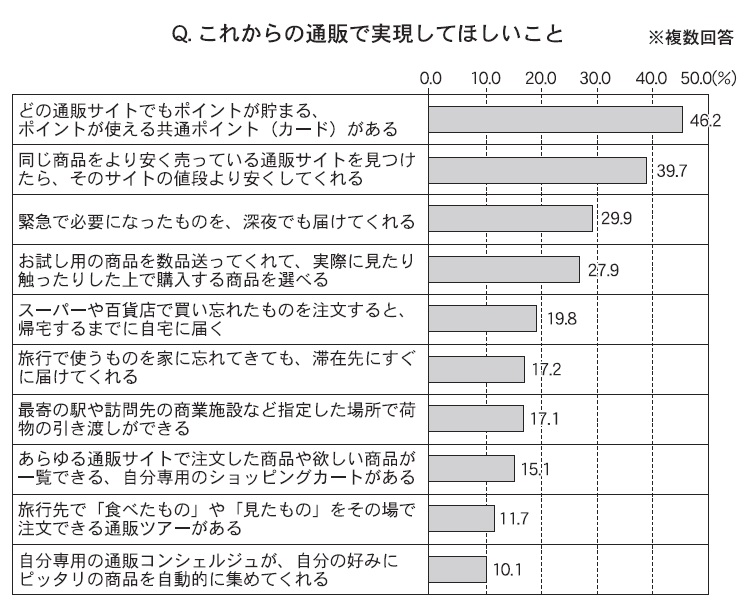 また、「これからの通販で実現してほしいこと」(同)については、「どの通販サイトでもポイントが貯まって、(ポイントが)使える共通ポイントカードがある」が46・2%でトップ。次いで「同じ商品をより安く売っている通販サイトを見つけたらそのサイトの値段より安くしてくれる」が39・7%、「緊急で必要になったものを深夜でもとどけてくれる」が29・9%、「お試し用の商品を数品送ってくれて実際に見たり触ったりした上で購入する商品を選べる」が27・2%、「スーパーや百貨店で買い忘れたものを注文すると帰宅するまでに自宅に届く」が19・8%という結果になった(表参照)。