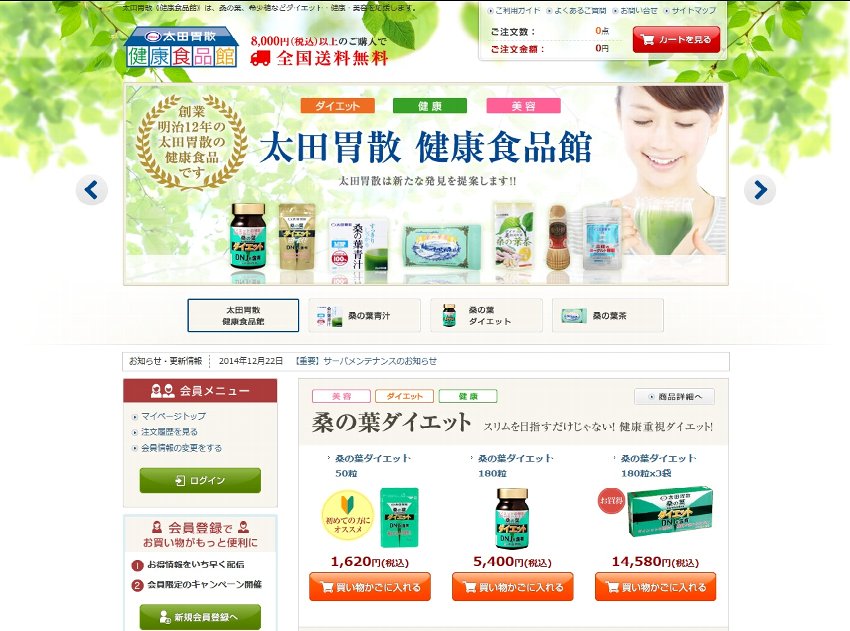 自社通販サイトは、「太田胃散健康食品館 本店」(=画像)。桑の葉ダイエットシリーズを中心に7品目12アイテムをラインアップする。