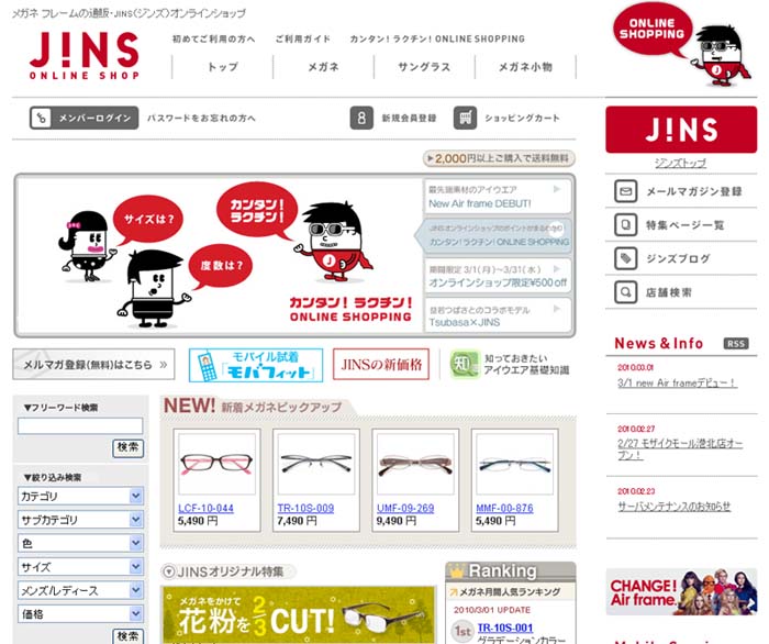 同社は2007年9月に通販サイト「JINS(ジンズ)オンラインストア」を開設した。現在、サイト上で取り扱う眼鏡は約2000種類。扱う商品の数や種類などは実店舗と同じという。主要な顧客層は20~30代。会員数やネット販売の売上高などは「まだ公表できる段階ではない」(同社)とするが、「確実に伸びている」(同)という状況だ。