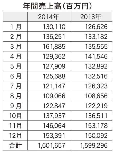 日本通信販売協会(JADMA)の売上高月次調査集計によると、主要会員企業145社の2014年(1~12月)の総売上高は前年比0・1%増の1兆6016億5700万円だった(表参照)。消費増税の導入に伴い、3月の駆け込み需要や4月以降の買い控えなど例年とは異なる動きがあったものの、通年で見るとほぼ横ばいの結果になった。