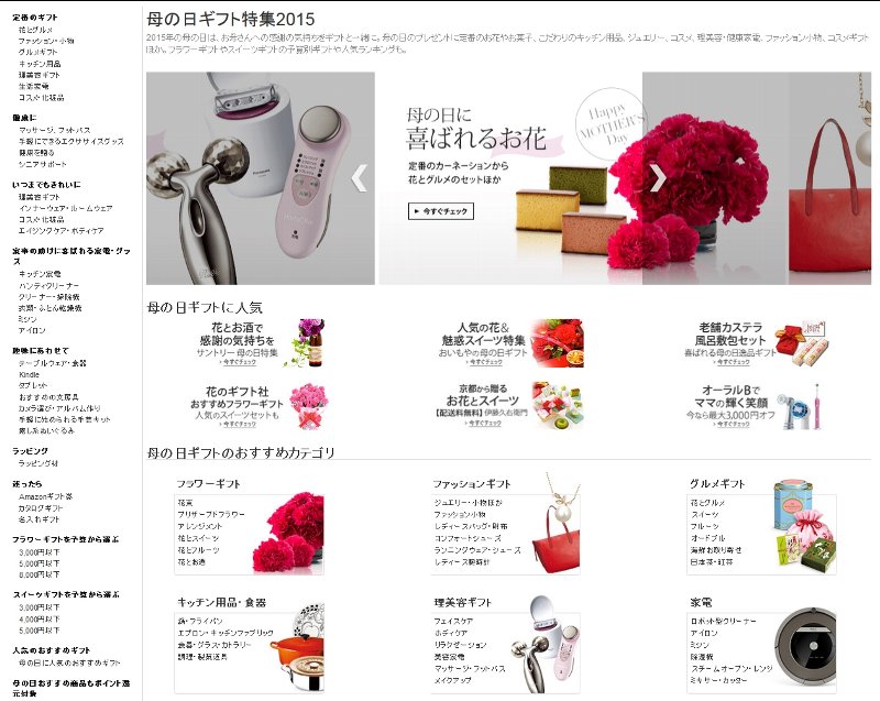 直近のイベントである5月10日の「母の日」では、例年の売れ筋である菓子と花のセット商品や近年需要が増している高級ギフトへの対応を強化すべく、今年は日比谷花壇と銀座文明堂の花とカステラをセットにした「特選五三カステラと花束のセット」(出品・日比谷花壇=価格5400円)や「母の日 さくらんぼギフトプレゼント秀品Mサイズ250グラムバラ詰ギフト箱入」(出品・フルーツライン=価格3500円)などを取りそろえたほか、ユニークな商品として湯を注ぐと"花が咲く"ことで人気の工芸茶「カーネーションの花が咲く工芸茶3粒&縦型ティーポット」(出品・ティートサイト=価格3420円)や、母の日ギフトとして人気のプリザーブドフラワーなども拡充させた。これら母の日ギフトは4月10日に設置した専用ページ「花の日ギフト特集2015」(画像)で販売する。