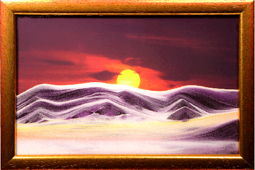 同商品は、密封された2枚のガラス板の間に内蔵した水・空気・砂で、砂丘や雪山などの風景を表現した動く絵画。絵を逆さまにして比重の異なる5種類の砂を落下させると、毎回違う絵柄に変わるようになっている。また、内蔵する空気の量を減らすことで、落下スピードが変化するため、1枚の絵の完成時間を、数秒から1日以上まで自由に操作できる。