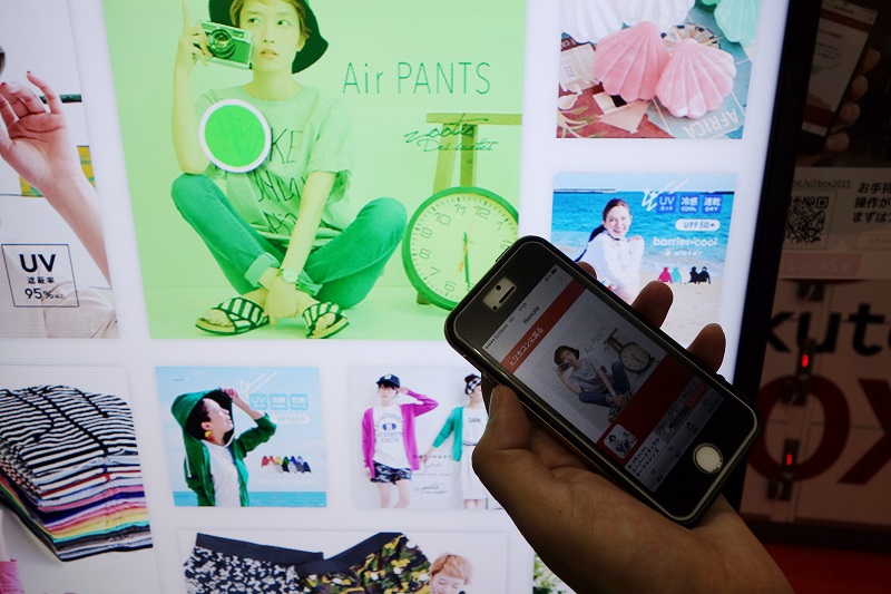 楽天グループのサービスも多数出展。駅などに設置する宅配ボックス「楽天BOX」のブースでは、手持ちのスマートフォンで操作できるデジタルサイネージを設置。大画面に表示されたカーソルをスマホで操作し、楽天市場で売られている商品が表示された部分に移動させてタップすると、実際に購入までできるというものだ(写真(上))。画面には別途広告も表示可能で、同社では今後、楽天BOXの設置された駅などに導入したい考え。