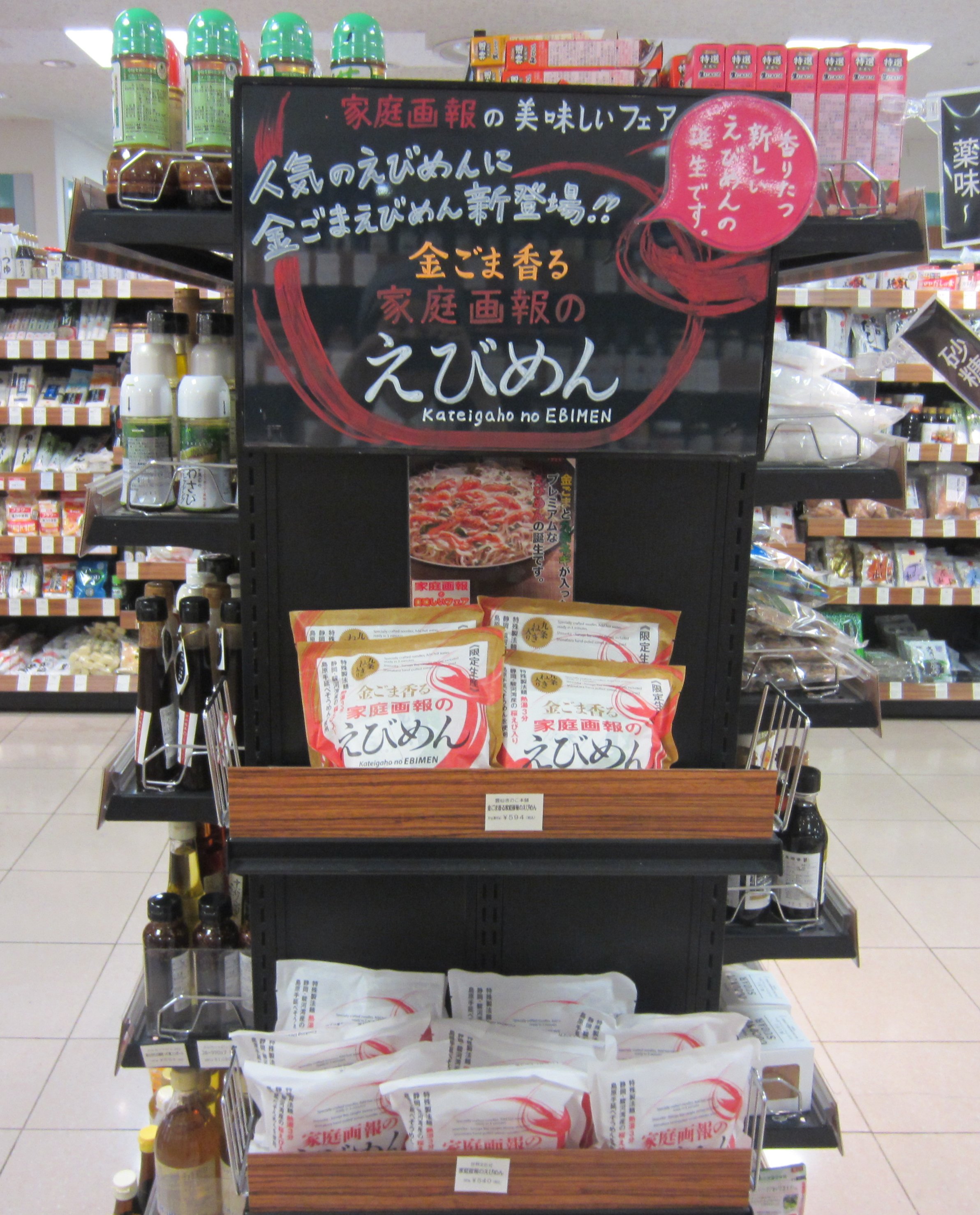 新商品は、雑誌「家庭画報」の女性編集者から「野菜の入ったえびめんが食べたい」とリクエストがあったため、いろいろな組み合わせを試したところ、当初路線からは少し変更したが、トルコ産の金ごまと九条ねぎを加えることで一層風味がよくなったことから、9~11月の3カ月限定で販売することになった。