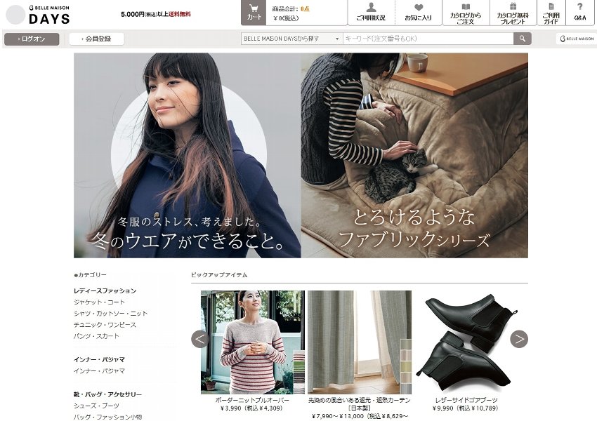 通販サイト「ベルメゾンネット」(画像(下))での販売に加え、主力媒体の「ベルメゾンファッション冬号」とインテリア雑貨カタログ「ベルメゾンすむとこ冬号」では巻頭に新ブランドの特集を展開しているが、10月中旬発刊の厳冬号では「ベルメゾンデイズ」の専用カタログを80万部発行する予定で、出だしの状況次第では増刷も行う。