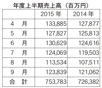 日本通信販売協会(JADMA)の売上高月次調査集計によると、主要会員企業約140社の2015年度上半期(4~9月)の総売上高は前年同期比3・8%増の7537億8300万円だった(=表参照)。消費増税の影響で落ち込んでいた前年度の反動から大きくプラスに転じており、ほぼすべての項目で伸長した。