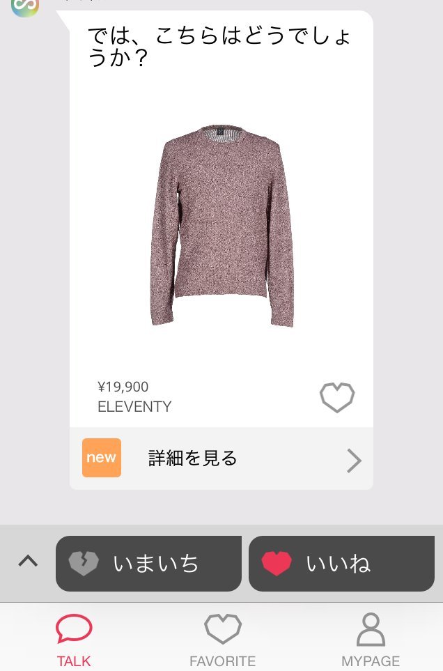 アプリ開発のカラフル・ボードが手がけているのが人工知能アプリ「SENSY(センシー)」。「センシー」ではユーザーに対して同アプリが専属のスタイリストのように商品を提案、それに対して「いまいち」か「いいね」で好き嫌いを選択する(=㊨画像)。これを繰り返すことで人工知能がユーザーの"ファッションセンス"を学習するため、選べば選ぶほど自分の好みに合ったアイテムが見つけやすくなるという。見つけた商品はそのまま提携しているブランドの通販サイトで購入することが可能だ。