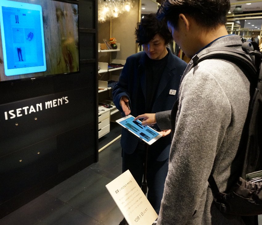 三越伊勢丹でも「センシー」に注目している。三越伊勢丹では11月25日から12月31日の期間、伊勢丹新宿本店メンズ館で「センシー」を活用した接客プロジェクトを実施。専用スペースにデジタルサイネージとタブレット端末を設置し、販売員が一人付いて、来店客に操作方法や商品の場所などを案内する(=㊦画像)。