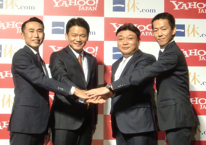 15日の都内で開催した記者会見の様子。左からヤフー・小澤ショッピングカンパニー長、ヤフー・宮坂社長、一休・森社長、一休・榊副社長)