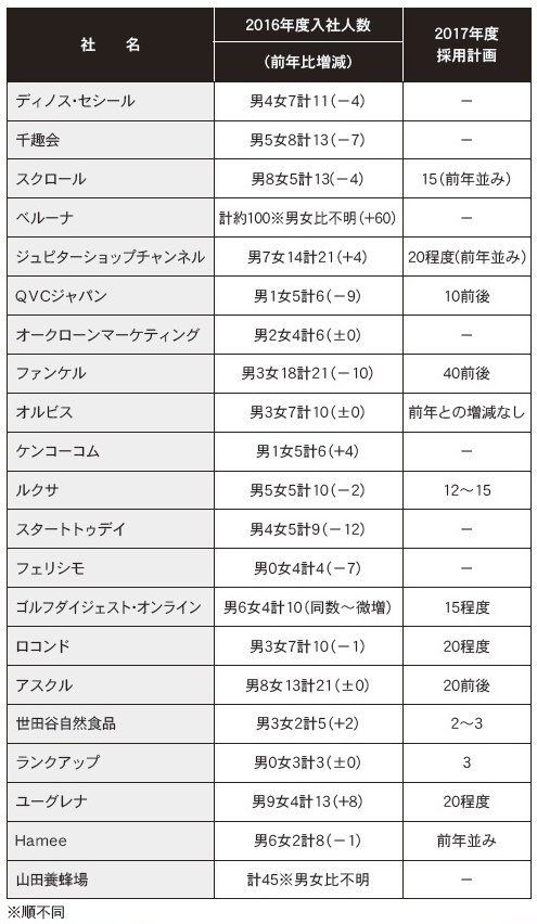【主要通販各社の2016年新卒採用】 採用数「前年割れ」が多数