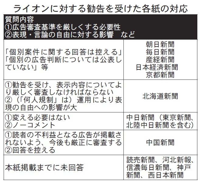 「審査を変える」 「勧告を受け、表示内容をより厳しく審査しなければならないと感じる」(北海道新聞)、「今回の件に限らず、読者を惑わせ、不利益になる広告が掲載されることがないよう、今後も厳正に広告審査する」(中国新聞)。ライオンのトクホ飲料への勧告を受け、その広告を掲載していた新聞社に動揺が広がっている。