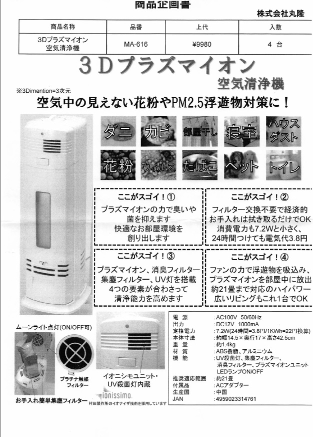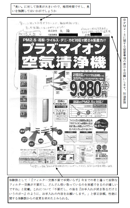 今回、措置命令の対象になった空気清浄機は、新聞広告で21畳の広さまで「PM2・5」や「防ダニ」、「除菌」、「抗ウィルス」、「花粉」「たばこ」に対応するかのように表現していた。だが実際、"21畳対応"のデータは、「PM2・5」に関する資料のみ。花粉などに関する機能は、丸隆にフィルターを納めていた村田製作所が5~10リットルの狭い空間内で行った試験データのみだった。このことが"表示のかい離"とみられた。
