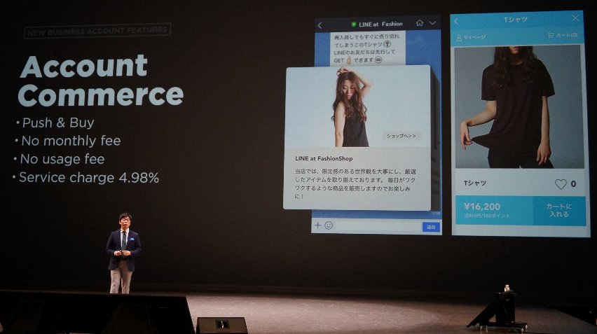 1つ目がネット販売機能で、実店舗などを対象とした廉価版アカウントの「LINE@」内で通販サイトを開設できるというもの。月額料金やシステム利用料は不要で、販売・決済手数料4・98%を徴収する。LINE執行役員でプラットフォーム担当の杉本謙一氏によると「『LINE』でプッシュ通知ができる業界最安のスマートフォンコマース」という。