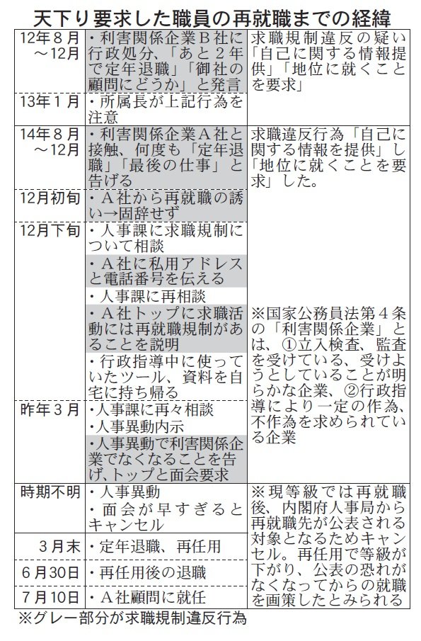 この職員は執行部門に在籍した12年から14年、複数の企業に「あと2年で定年退職」などと発言、利害関係企業に天下りを要求していた(=表)。
