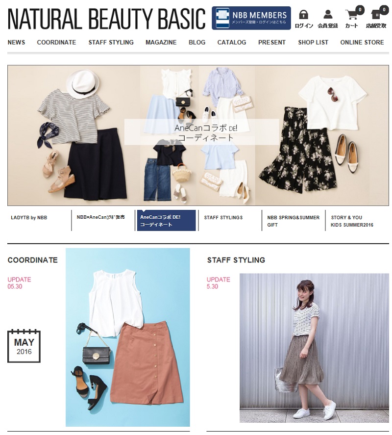 とくに、「マーガレット・ハウエル」と「ナチュラルビューティーベーシック(NBB)」(=画像)というテイストや価格帯が異なる主力ブランドを先行して開設したところ、ECと実店舗を併用する顧客の購買単価は、どちらか一方の販売チャネルだけを利用している顧客に比べ、前者のブランドではプロパー期で約2・7倍、セール期は約3倍に、後者もプロパー期で約2・5倍、セール期は約2・7倍となり、ブランドに触れてもらえる時間が多いほど購買額が高まる傾向が得られたことをグループ内で共有し、前期のO2Oサイトの開設ラッシュにつながったようだ。