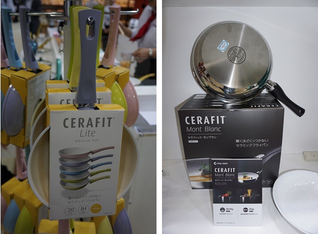 同社のブースでは現在までの国内累計販売数が400万枚を突破している売れ筋の"焦げ付かない"フライパン「セラフット」シリーズのさらなる拡販のために今後、投入する計画の廉価版となる「セラフィットライト」と高級版の「セラフットモンブラン」を初めて展示した。