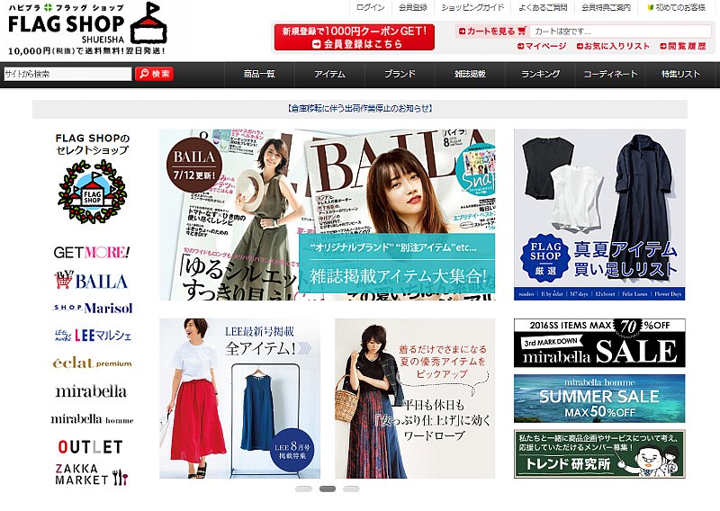 通販サイト「フラッグショップ」(=画像)の集客策では、同社運営の女性向け情報サイト「ハッピープラス」および女性ファッション誌のウェブサイトからの導線を強める。現在進めている各雑誌サイトのリニューアルを機にEC連携を深める。例えば、雑誌「マリソル」のサイトを7月7日に刷新したが、オープン記念として同誌オリジナルブランドの「エムセブンデイズ」で体型をカバーしてくれるワンピースを商品化。雑誌サイトでも紹介してECへの集客と購買につなげた。