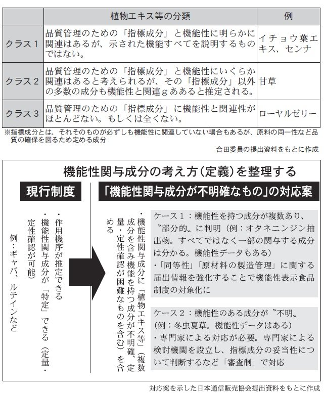 日本通信販売協会はこうした素材の一部を例示。機能を発揮する成分が部分的に分かる素材は、機能性や安全性データと製品に使う原料が同等であることを示す情報や、原料の製造管理方法など「届出項目の強化」によって対象とすることを求めた。合田幸広委員が示した素材のクラス分けにおける「クラス1、2」に該当するものだ。