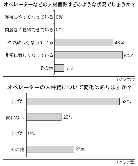 アンケートではまず「オペレーターなどの人材獲得はどのような状況でしょうか?」と尋ね、5つの項目から選択してもらった(グラフ(1)参照)。