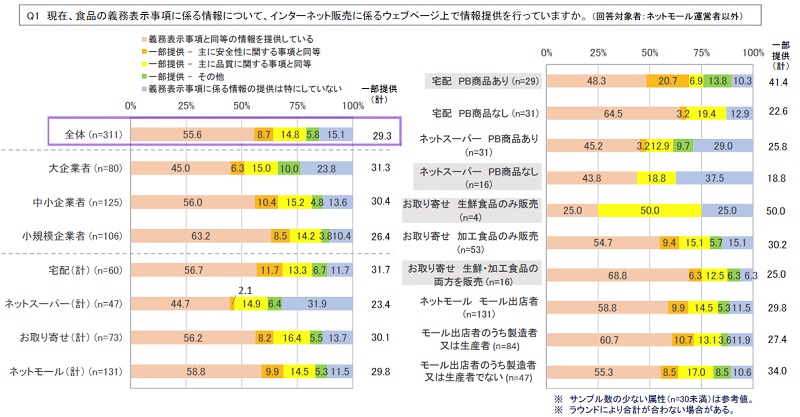 義務表示事項に関する情報提供の取り組む事業者のうち、表示範囲について、「商品ラベルと同等の表示をしている」が55・6%、「商品ラベルの一部の情報を提供している」が29・3%。「特にしていない」は15・1%だった。