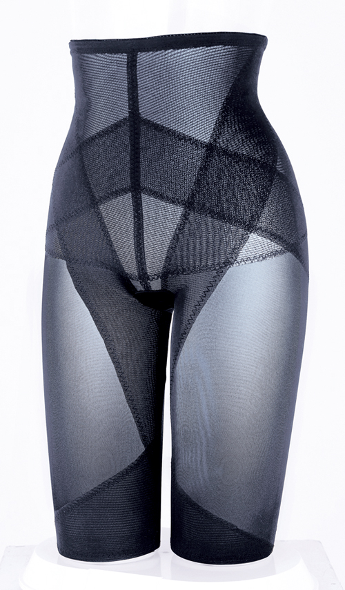新商品は「ファイブスリミングショーツEX」(税込1万1000円)。既存商品に比べ、ウエストを三センチ長くした「ハイウエスト加工」と、太もも全体を包み込む「ひざ丈タイプ」を特長としている。もちろんひざ周りにもパワーネットを配置。"ひざ肉"をしっかりとカバーする。