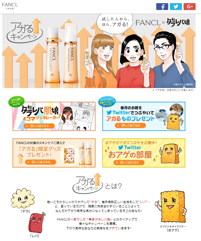 伝えたい機能は、30~40代女性の悩みである「ハリ」や「弾力」をサポートすること。この機能を代弁するキャラクター「おアゲ」を描き起こしてもらい、これを軸にコミュニケーションを展開した。「肌が、下りのエスカレーターに乗ってしまった」「信じたくないが、下がってきた気がする」など下がってきた肌の心理をつくようなコピーで肌を上げることをサポートすることをイメージさせる。