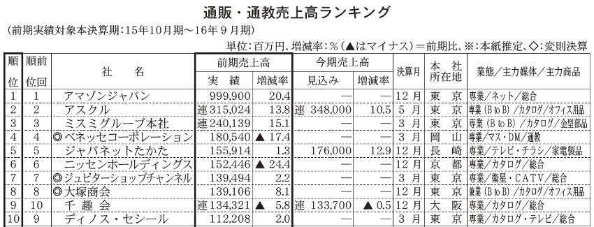 通販新聞社が2016年12月に実施した「第67回通販・通教売上高ランキング」調査によると、上位300社の合計売上高は6兆2341億円で、15年12月調査時と比べ5・8%増加した。伸び率は前年同期調査時の4・4%増からアップ。また上位200社での合計売上高は前年同期調査時に比べ5・8%増の5兆8345億円になっている。。(※表は週刊通販新聞本紙で掲載した1~300位までの売上高ランキングの中から上位10位のみを掲載。11位~300 位および、利益率・増収率ランキングなどは本紙のみに掲載しております。 「通販新聞」の購読はこちらを覧下さい)