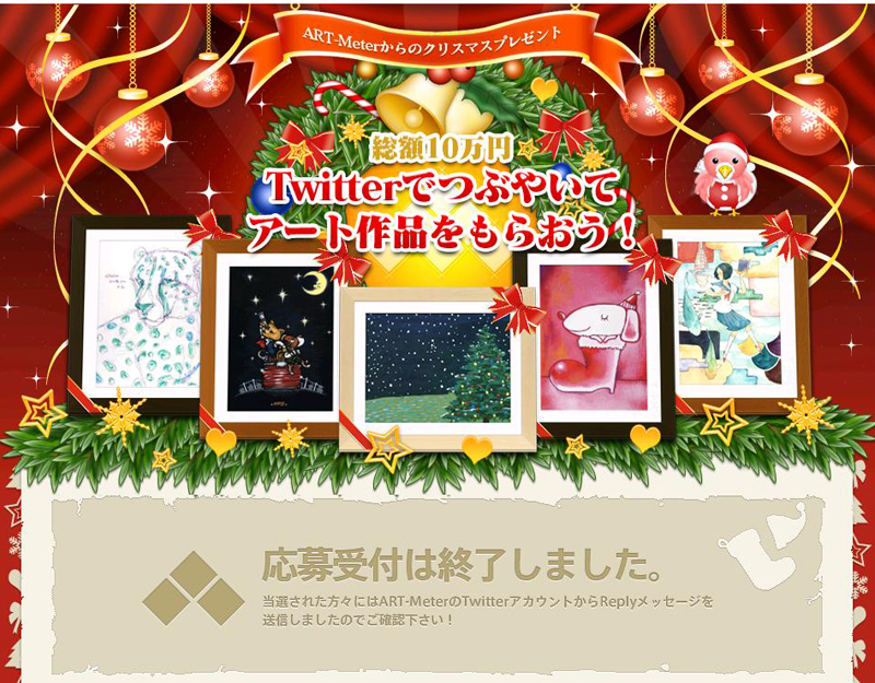 そうした方針を具体化した施策が、12月に開始した「総額10万円 Twitterでつぶやいてアート作品をもらおう!」(=画像)。参加者の中から当選した10人に絵をプレゼントするキャンペーンだ。
