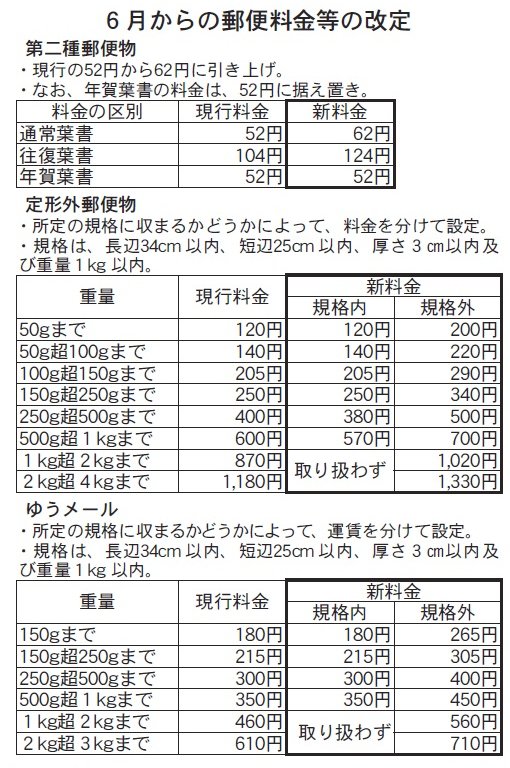 郵便料金の改定は1994年以来となる。改定するのはハガキの第2種郵便物と、通常郵便物の第1種郵便物のうち定形外郵便物。ハガキは現状の52円から10円値上げし62円となる。また往復ハガキは104円から124円と20円の値上げ。年賀ハガキに関しては52円に据え置くとし、12月15日から翌年1月7日の間に差し出した通常ハガキで表面に「年賀」の文字を朱記したもの(私製のハガキ含む)を対象にする。