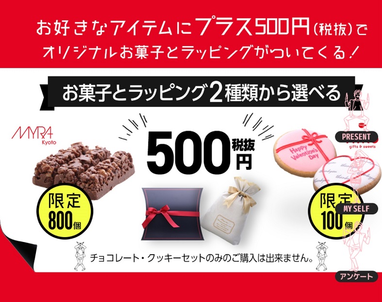 バレンタイン専用ラッピングは、菓子と包装をセットにして500円(税込)で販売。菓子と包装は2種類ずつ用意し、ユーザーは組み合わせを自由に選択できる。