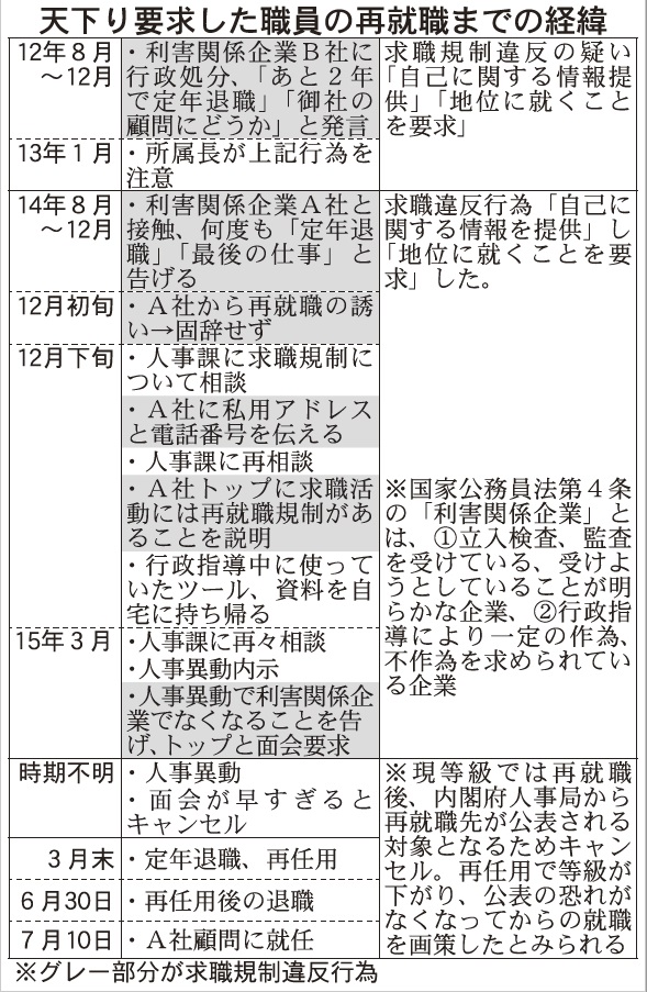 消費者庁は立入検査後の15年10月、再就職等監視委員会に元職員の国家公務員法違反の疑いがあることを報告している。だが、違反を認定できず、昨年3月、監視委が違反の事実を公表。監視委は「利害が見えやすく確信犯的。求職を伺わせる十分な証拠を入手しながら積極的に解明しなかった」とその対応を批判している。
