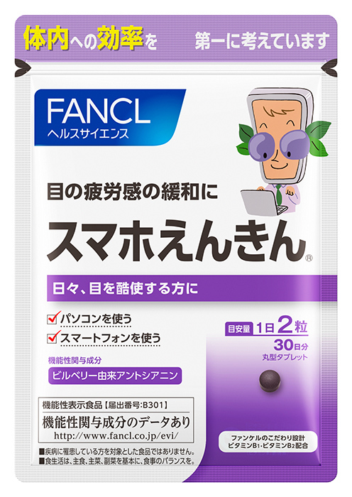 3月17日に発売する機能性表示食品「スマホえんきん」(=画像、税込1563円)は、スマートフォンやパソコンの利用頻度が高い層にターゲットを絞って展開するもの。機能性関与成分は「ビルベリー由来アントシアニン」。機能性はシステマティックレビューで評価。「スマートフォンやパソコンなどで目を酷使する作業時に、目の焦点を合わせやすくすることで目の疲労感を緩和する」といった機能を表示する。通販のほか、直営店舗やドラッグストアなど一般流通でも展開する。