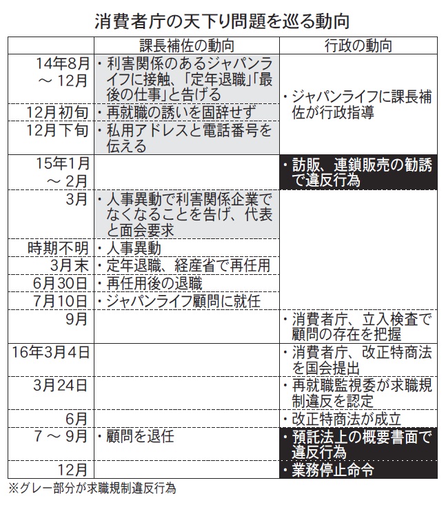 「面識のある職員はいる」。ジャパンライフの会社案内に法律顧問として紹介されている水庫氏の確認を部会で求められ、消費者庁は「庁に在籍した職員の経歴と一致する」と認める。だが、監視委に天下り認定された職員とイコールであるかは明言を避け、「認定されたのは課長補佐級の法執行関連業務を担う職員」と話すのみ。「処分の調査期間にも接触はなかった」とする。