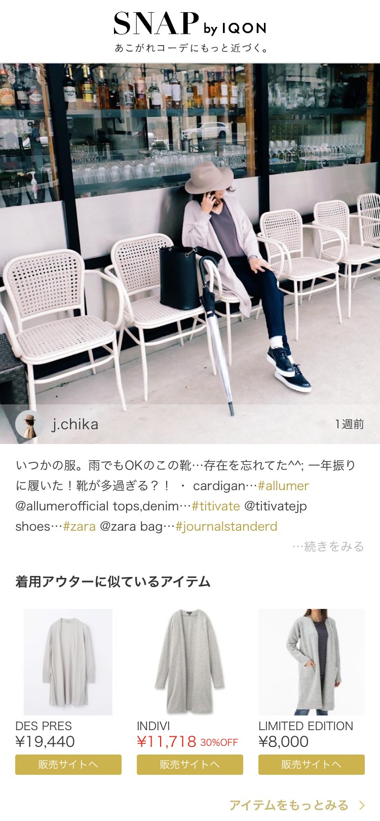 そうした課題を解決するのが「スナップ バイアイコン」で、"あこがれコーデにもっと近づく"をコンセプトに、インスタグラマーが着用する商品と似ているアイテムを提案する。