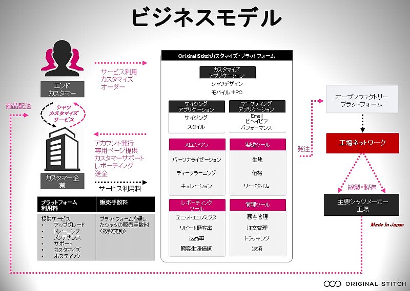 すべての機能はオリジナル社がクラウド上で管理・運営し、同プラットフォームを利用する企業はすぐに新規事業としてオーダーメードシャツ通販を始められる。注文を受けたシャツは、「オリジナルスティッチ」と同様、日本国内の提携工場で生産されるという。