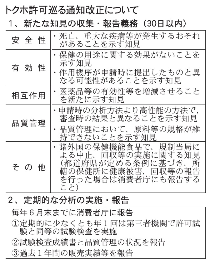 日本サプリメントのトクホ問題を受け、消費者庁が特定保健用食品(トクホ)の運用を見直す。企業に「新たな知見」を得た際の報告義務を課すほか、定期的な関与成分の分析も求める。3月17日付で、トクホの許可申請に関する内閣府令、次長通知を一部改正した。同月21日の消費者委員会で消費者庁が報告。消費者委は「建議の取り組みが前進したことを高く評価したい」(河上正二委員長)とコメントした。
