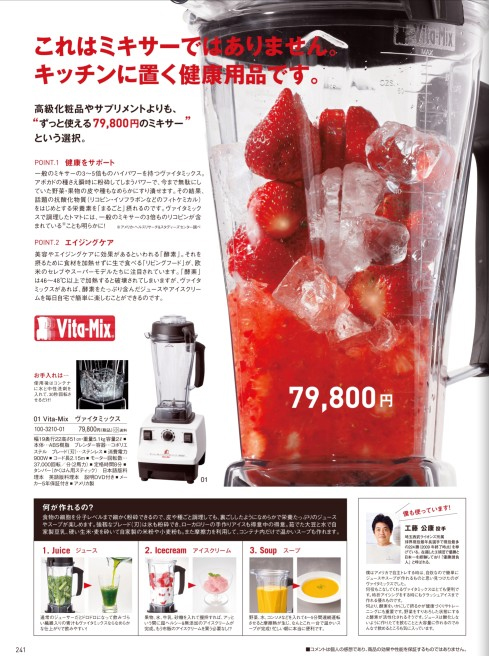 こうした「ヴァイタミックス」の特徴や機能性について分かりやすく訴求するため、カタログ誌面上で「これはミキサーではありません。キッチンに置く健康用品です。」というコピーを掲載した。その理由として「高級化粧品やサプリメントよりも、"ずっと使える79,800円のミキサー"という選択。」と説明。