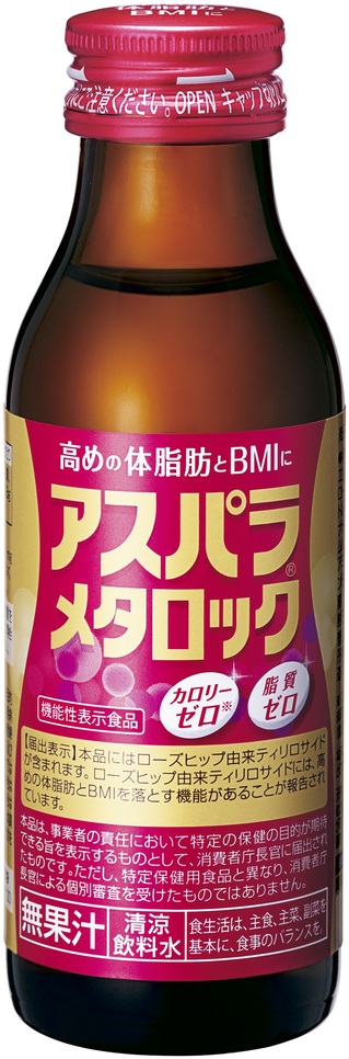 「アスパラメタロック」は、森下仁丹の独自素材「ローズヒップエキス」を配合したもの。「高めの体脂肪とBMIを落とす機能があることが報告されています」といった表示を行う。一方、田辺三菱製薬が長年展開する栄養ドリンクの「アスパラ」ブランドの知名度を活かして販売につなげていく。「アスパラ」ブランドで使うフレーバーを使い、「カロリー・糖質ゼロ」と機能性表示で訴求する。