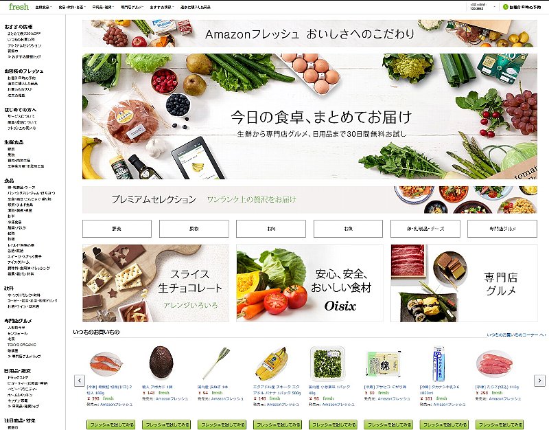 「Amazonフレッシュ」は野菜や果物、鮮魚、精肉、乳製品といった生鮮品・食料品など約1万7000点を中心にキッチン用品や健康・美容用品、ベビー用品、ペット用品などの日用品・雑貨なども展開し、合計約10万点を年会費税込3900円を徴収した有料会員「アマゾンプライム会員」に対してさらに別途月額税込500円を徴収した会員に行なう配送サービス。アマゾンの既存のPC、モバイルサイトやアプリから注文を受け付ける。