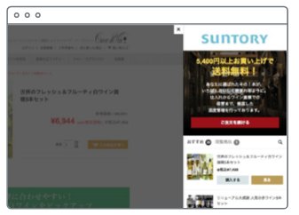 実際、昨年4~5月のテストでは、サントリーマーケティング&コマースが運営するワイン通販サイト「カーヴ・ド・ヴァン」への導入ツールをポップアップ型の「ヴィプロンプト」から「ヴィパネル」に切り替え、表示内容もサービス訴求文を中心としたクリエイティブから、訴求文に加えて関連商品や閲覧履歴のリストを表示(=