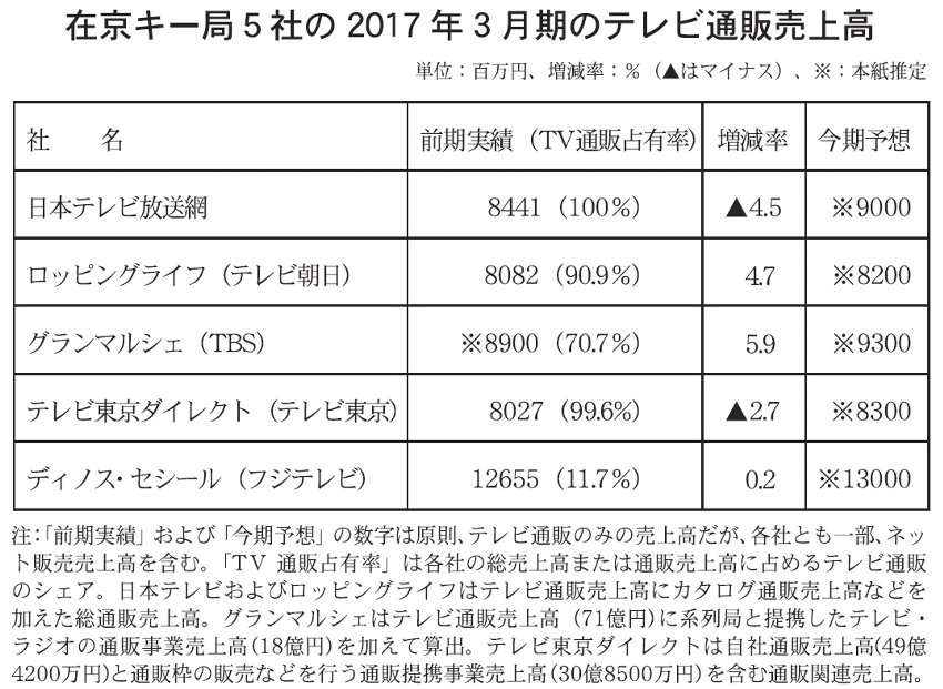 在京キー局の前期TV通販売上高、ディノス・セシールがトップ、グランマルシェも順調な着地