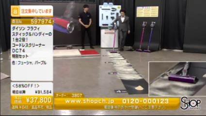 1日あたりの1商品での販売額の過去最高記録を更新したのはコードレス掃除機本体に加えて、隙間ノズルなど特別な付属品を付けたセット「ダイソン フラフィ スティック&ハンディの1台2役!コードレスクリーナーDC74特別セット」。同商品は6月4日に放送した家電のみを24時間に渡って紹介する特別編成番組「オールスター家電祭 2017夏」でその日に最も訴求したい商品を紹介する「ショップ・スター・バリュー」などで繰り返し、合計11時間に渡って紹介したもの(=㊤写真は当日の番組の様子)。なお、当該商品は通常は税込9万1584円で販売するが、当日限定で58%引きの同3万7800円で販売した。