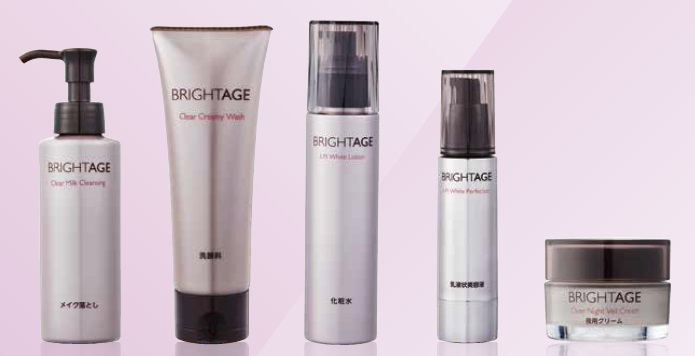 新ブランドは「BRIGHTAGE(ブライトエイジ)」。乳液状美容液「リフトホワイト パーフェクション」(40グラム1・5カ月分、税抜8000円)をはじめ、メーク落とし、洗顔料、化粧水、夜用クリームの5アイテム(=画像、税抜3000円~8000円、美容ドリンク、コットンを除く)を展開する。美容液は、1本で「ハリ、美白、保湿」に働きかける"機能のオールインワン"を強みにする。