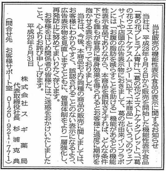規制改革の一環で導入された機能性表示食品をめぐる状況が変化したのは5月だ。ドラッグストアチェーンのスギ薬局が販売する機能性表示食品「葛の花プレミアム青汁」(=画像)など3商品について突如、広告が不適切であると自らの非を認める「社告」を掲載。以降、6月にテレビショッピング研究所、8月に日本第一製薬が同様の社告掲載に至ったためだ。