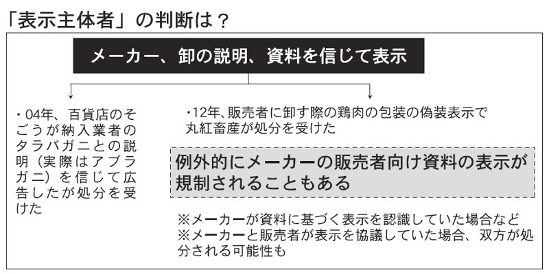景表法が消費者庁に移管される前の2004年、公正取引委員会は百貨店のそごうのほか2社に対する排除命令(現在の措置命令)を下している。納入業者の「タラバガニ」との説明を信じ広告したが、実際は「アブラガニ」だった事例だ。そごうは当時「納入業者が説明した」と釈明したが、責任を免れなかった。