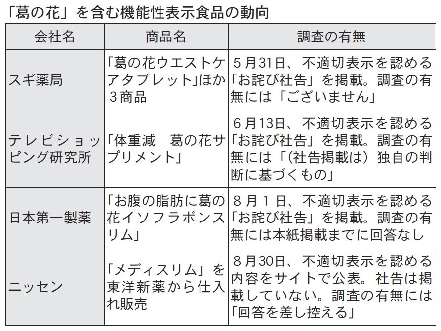 誰かが「逸脱」 「SR」により制度を活用する販売企業には、原料やOEMメーカーから一律に根拠資料が示され、サポートを受けて届出が行われる。「葛の花」も東洋新薬の独自原料であり、多くの企業にOEM供給されていた。広告は基本的に各販売企業の判断。表現の程度も異なる。